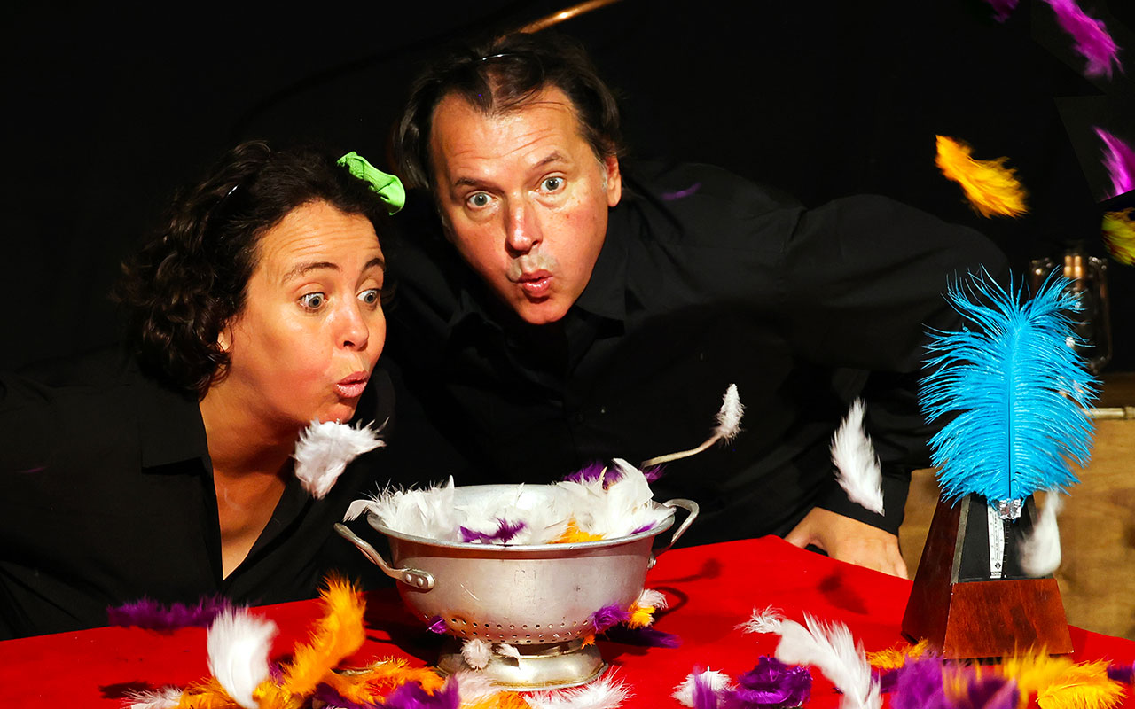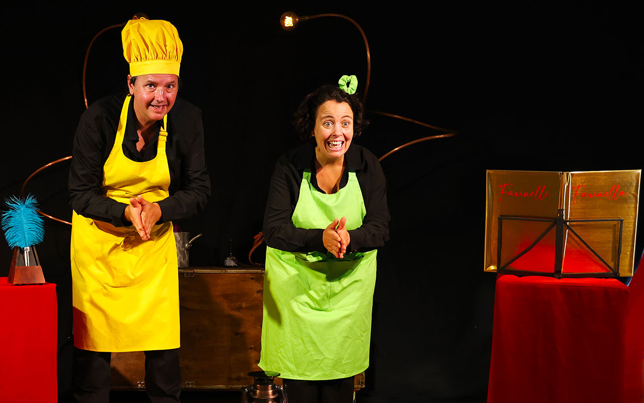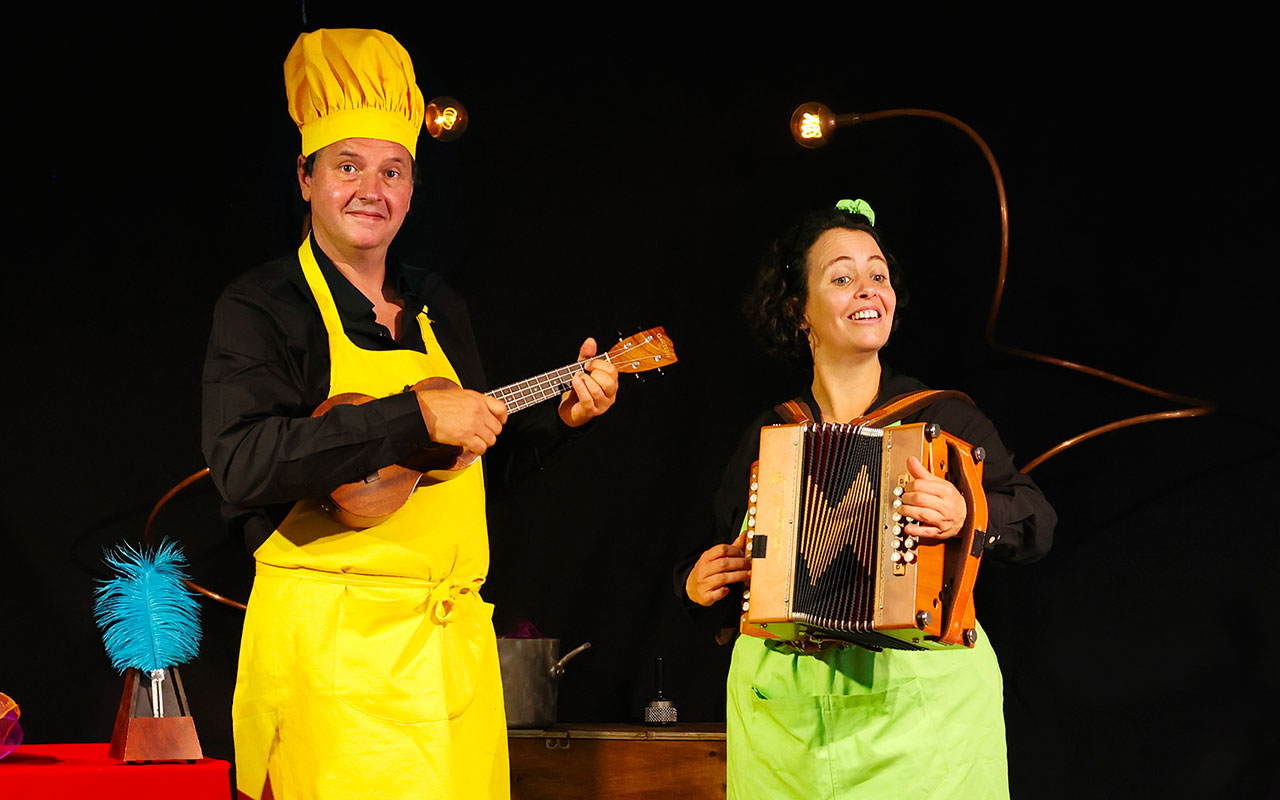 Farinelli Farinella, c’est des recettes musicales et magiques, accompagnées de chants, de percussions corporelles et multiples petits instruments (kazoo, flute à coulisse, boules chinoise, bâton de pluie, appeaux, œuf, cabassa, ukulélé et accordéon).