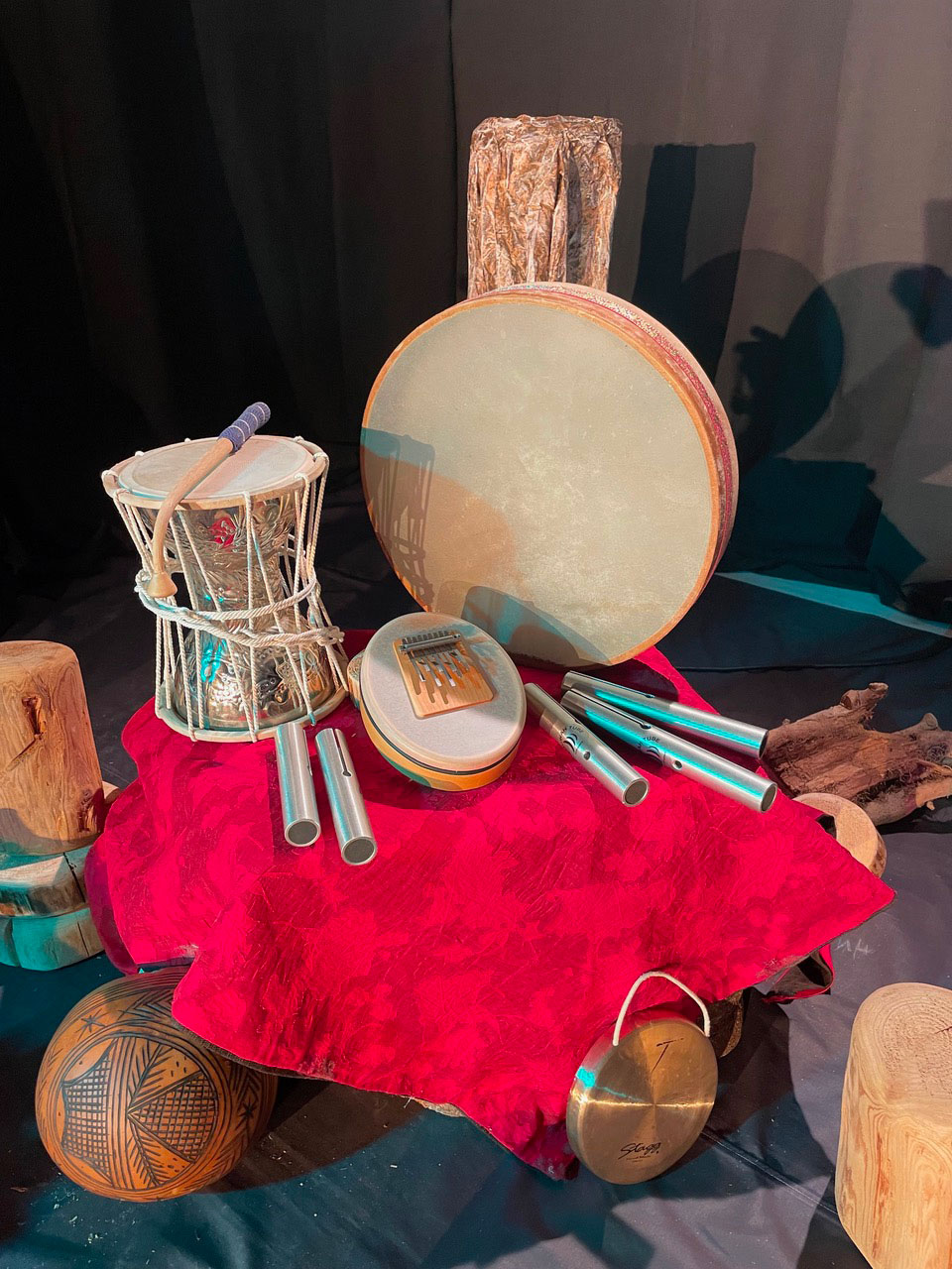 Flûte traversière, boite à tonnerre, shruti box, kazou, ocean drum, wah-wah tubes, sansula : chaque instrument illustre son personnage. De par son jeu malicieux, Angéline donne une couleur particulière à chaque scène.